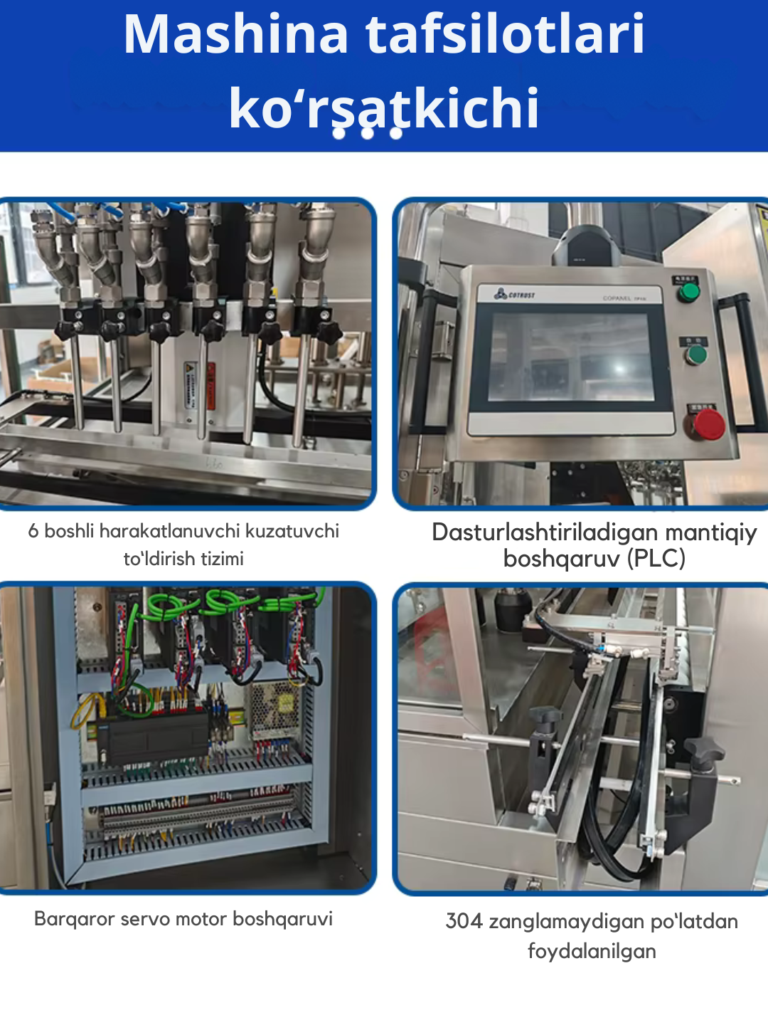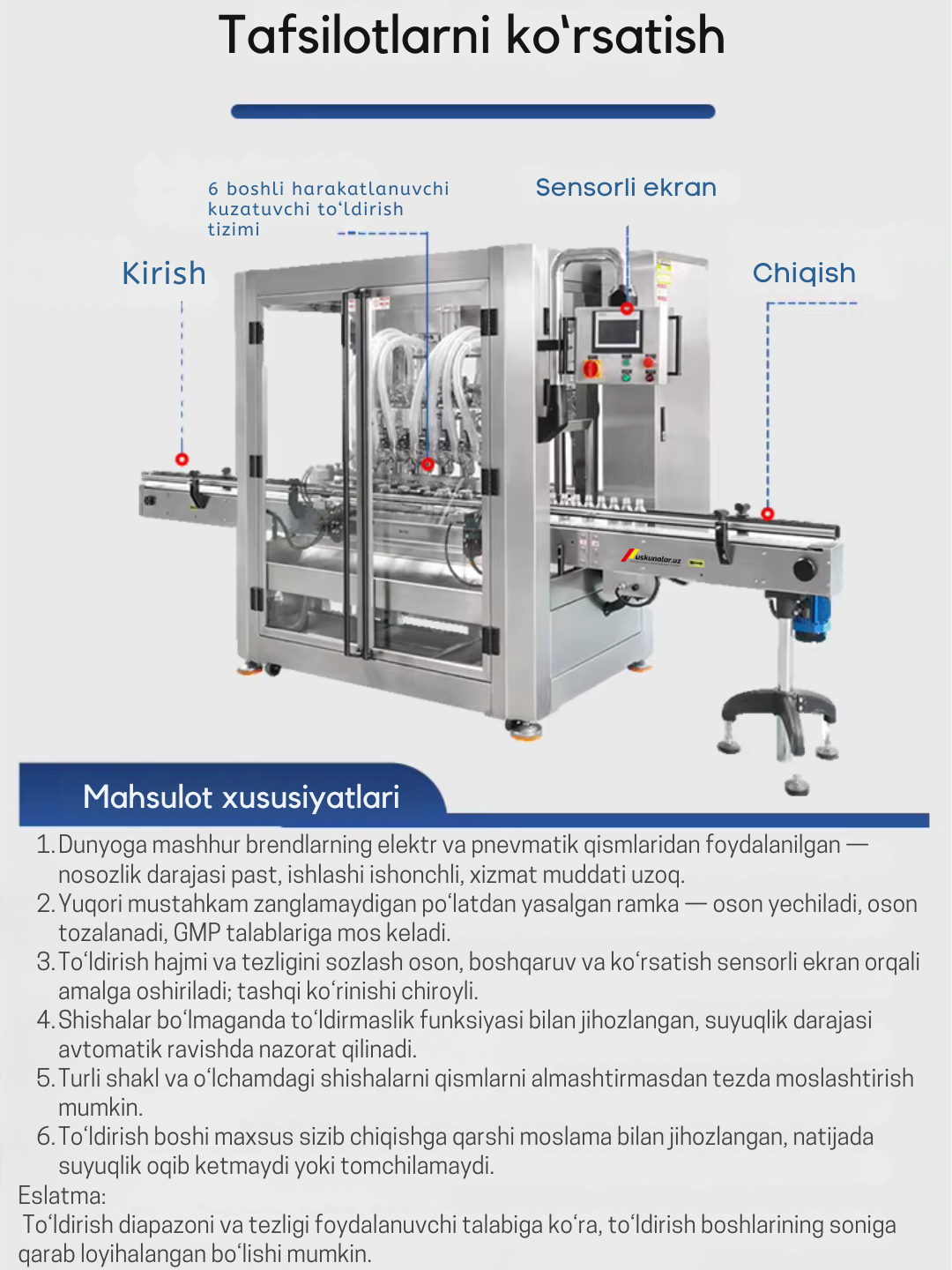 Ushbu uskuna suv, ichimliklar, meva sharbatlari, sut, yog‘, sirka, dori eritmalari va boshqa turdagi suyuq mahsulotlarni butilkalarga avtomatik to‘ldirish uchun mo‘ljallangan. Ishlab chiqarish jarayonini tezlashtiradi, aniqlikni oshiradi va gigiyena talablariga to‘liq javob beradi.