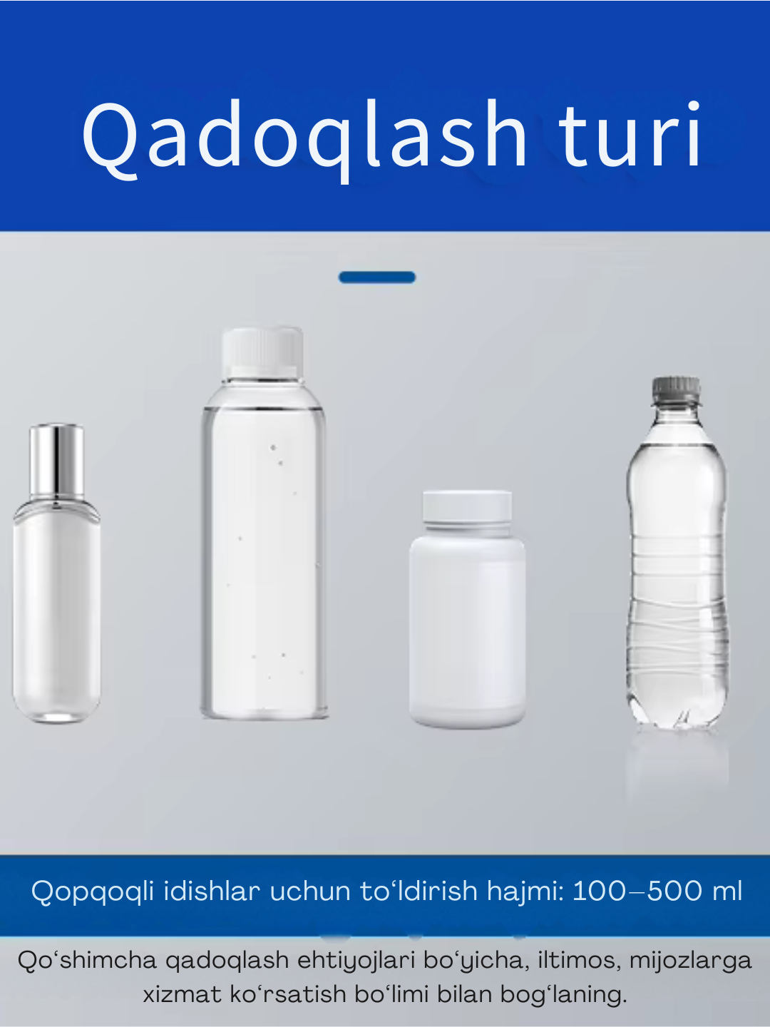 - To‘ldirish hajmi: 50–1000 ml