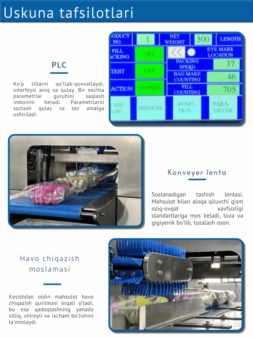 ✅ Avtomatik va gorizontal qadoqlash tizimi — barqaror ishlash, yuqori samaradorlik ✅ PLC + sensorli ekran boshqaruvi — oddiy interfeys, tez sozlanish ✅ SUS304 zanglamaydigan po‘lat korpus — oziq-ovqat gigiyenasi va mustahkamlik ✅ Energiya tejamkorlik va barqarorlik — 3.2 kW quvvatda yuqori unumdorlik ✅ Universal ishlov — shokolad, non, baton, pechenye, vafli va boshqa mahsulotlar uchun mos ✅ Yuqori sifatli sealing (issiq yopish) — qadoq mustahkamligi va jozibador ko‘rinish