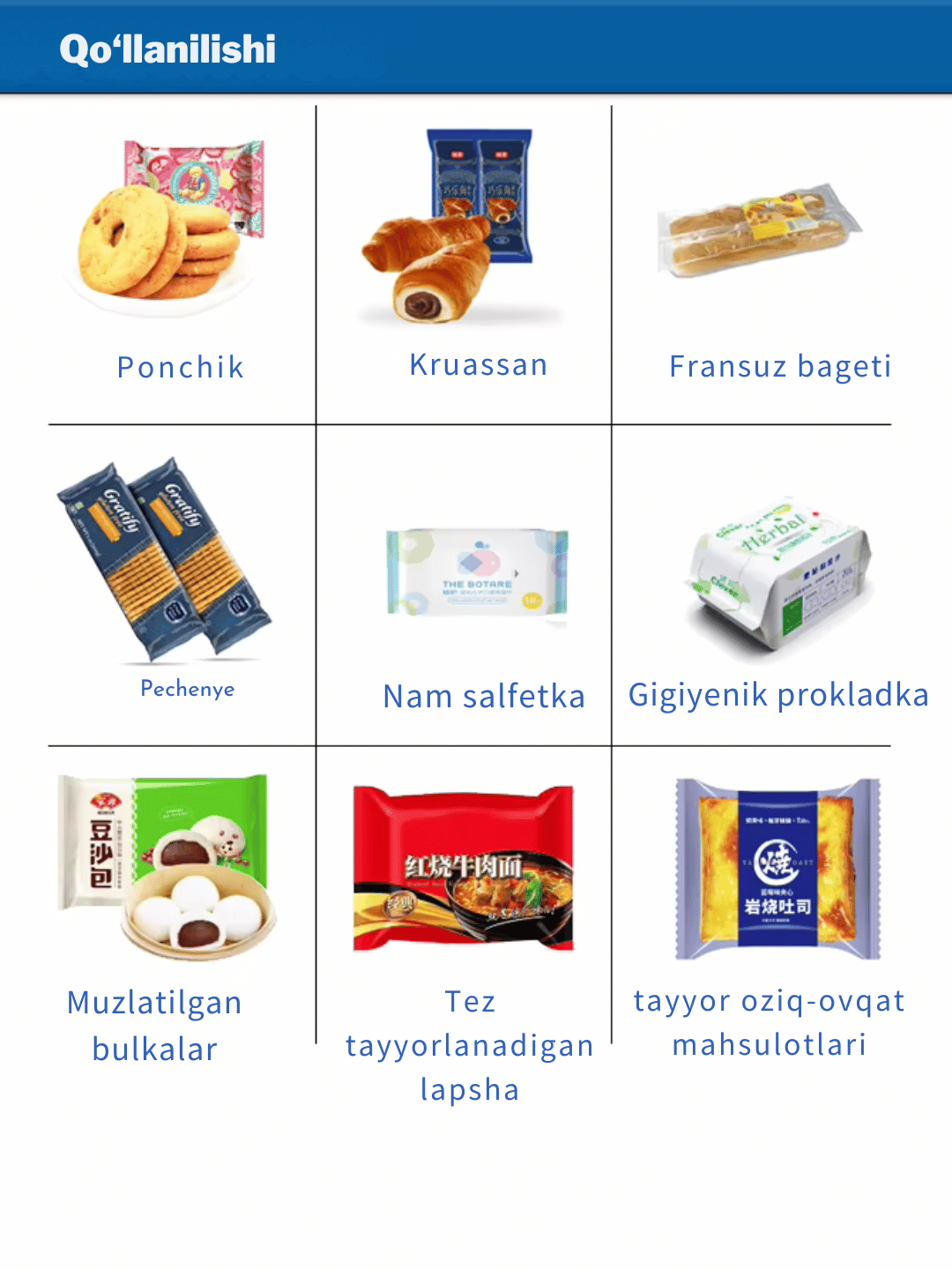 Bu avtomatik oziq-ovqat o‘rash mashinasi (automatic food packaging machine) turli mahsulotlar uchun ishlatiladi: